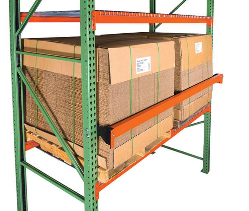 - Rack-mounted pallet stops attach directly to uprights and provide a hard stop during placement